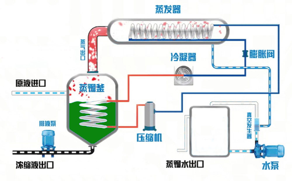 熱泵蒸發器采用熱泵壓縮的原理,在兩端輸出熱媒和冷媒同時對物料進行蒸發和對蒸汽進行冷凝,與此同時高真空度保證物料能在低溫度下進行蒸發,這就解釋了為什么熱泵蒸發技術在小型蒸發應用上節能及環保。
